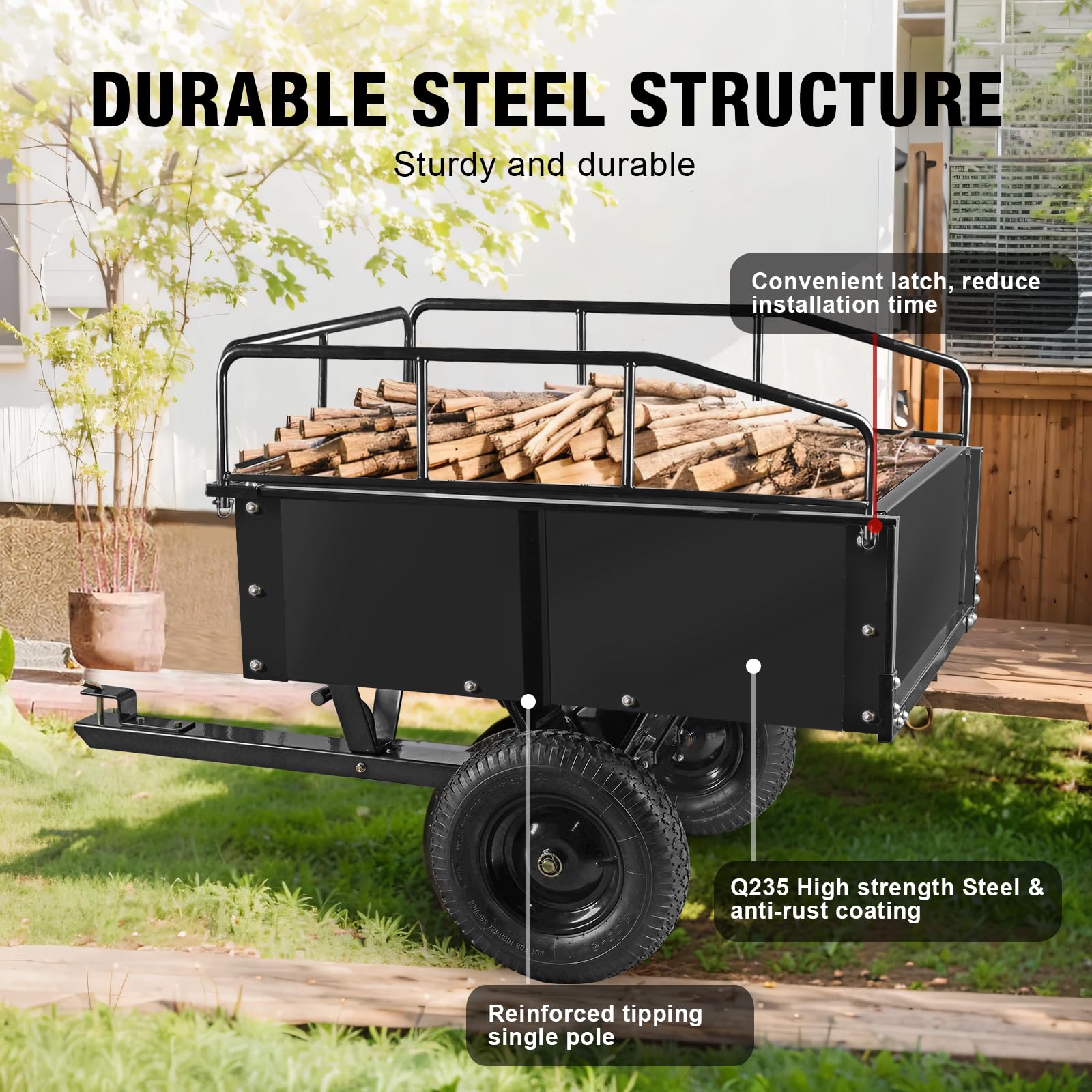 - ENHANCED TRAILER STRUCTURE: Compared with any other dump trailer, our BIG RED dump cart can carry up to 750 pounds with enhanced durability. The side plates are thickened to 0.04", the axle is thickened and the site support structure is strengthened, improving the overall load-bearing capacity and effectively prevent trailer deformation under high load.