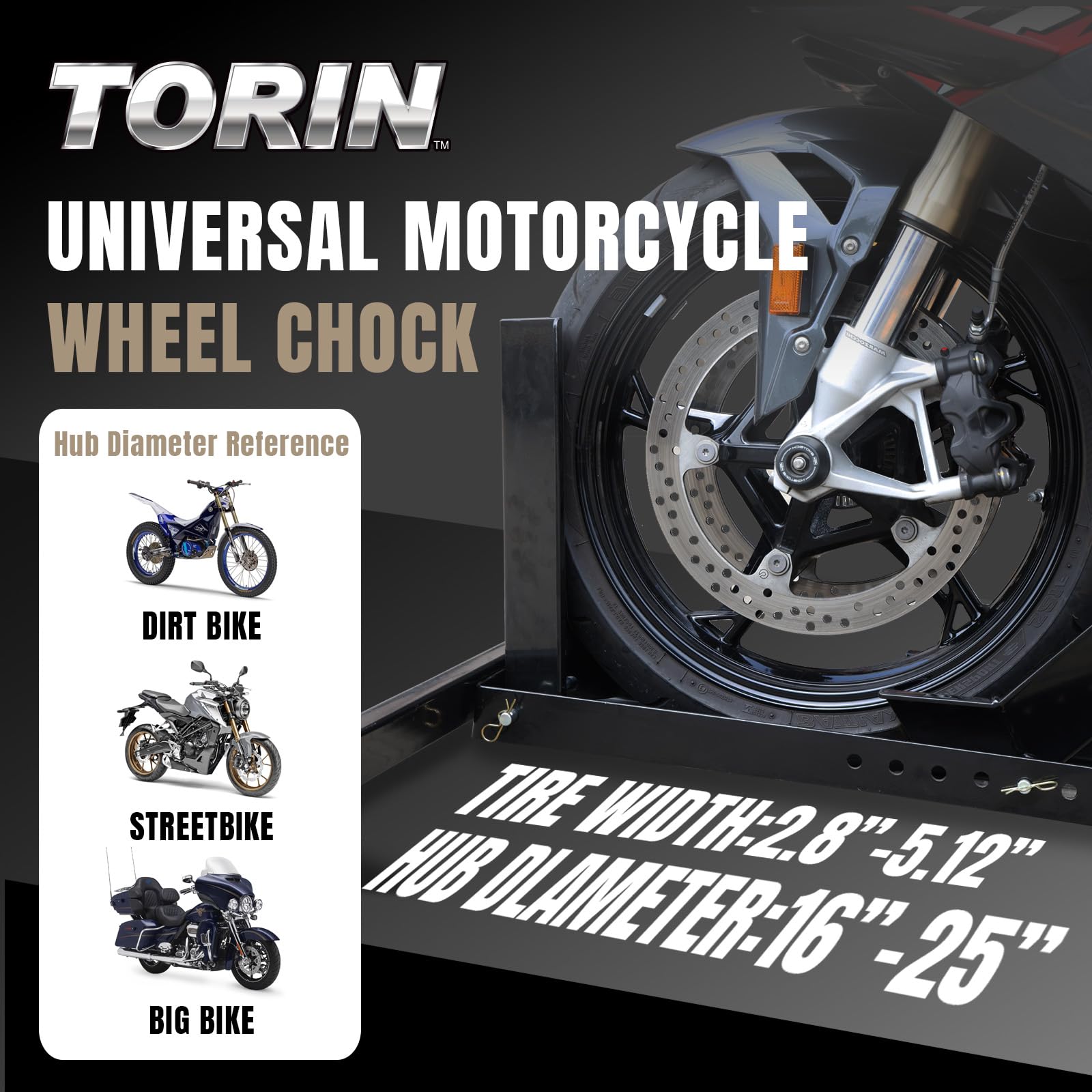 - FOR MOST MOTORCYCLES: The 1800 lbs motorcycle wheel chock has exceptional versatility accommodating wheel diameters ranging from 16 to 25 inches (406.4-635mm) and tire widths from 2.8 to 5.12 inches (70-130mm) with full versatility and ergonomically designed for off-road motorcycles, standard motorcycles, heavy motorcycles, and more